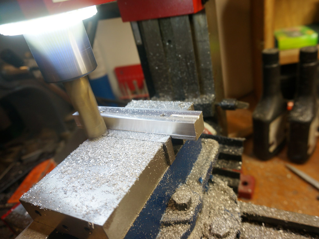 I sawed a bit off it, twice as long as my finished clamp is to be high. Here it is fresh off the bandsaw, clamped in the mill.
