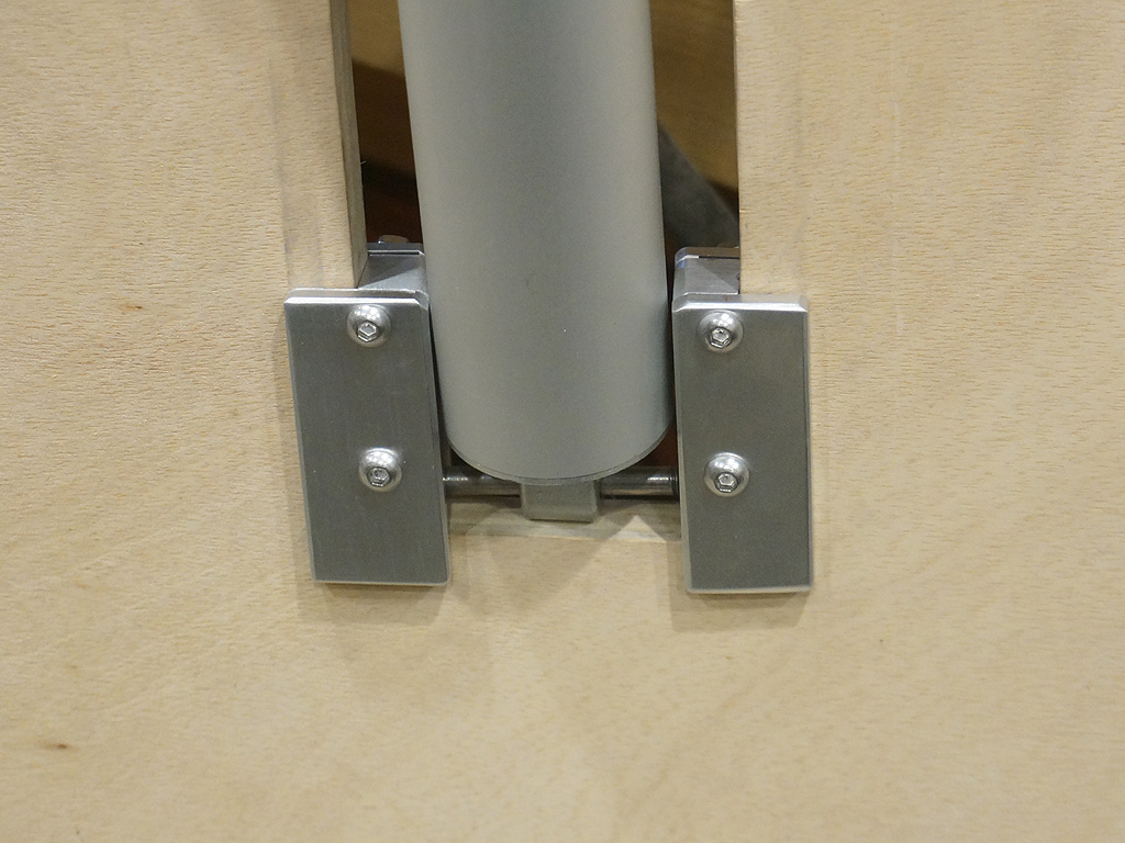The [ shaped sideplates each bridge the T-flange on their side of the core across to the plywood on the far side, as the screw clamps the center together. The idea is that I can loosen the clamps, slide the whole assembly up and down to -precisely- level the pinball playfield, and then tighten the four screws and grab the heck out of the plywood to nail the actuator's axle in place anywhere along the slot in the back wall that I need it to fall for the geometry to work.