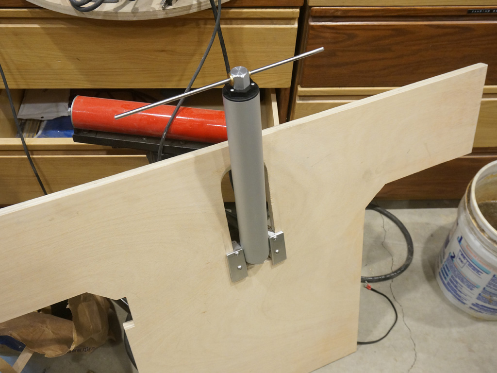 The playfield rotation is done by a high speed electric linear actuator pushing or pulling on a long 1/4" spring rod on the TV mount, which accounts for the upper moving ram end of the actuator. The lower end of the actuator needs to be anchored into what is the left-hand wall of the pinball cabinet / the back wall of the cockpit. This needs to be on an axle, since it rotates on an arc, which is parallel with the 3'-by-3' skewed TV axle. Additionally, I know already that it will drive my OCD crazy if the pinball table isn't level, left-to-right, so I want this lower mounting axle to be micro-adjustable vertically to get that position perfect.
