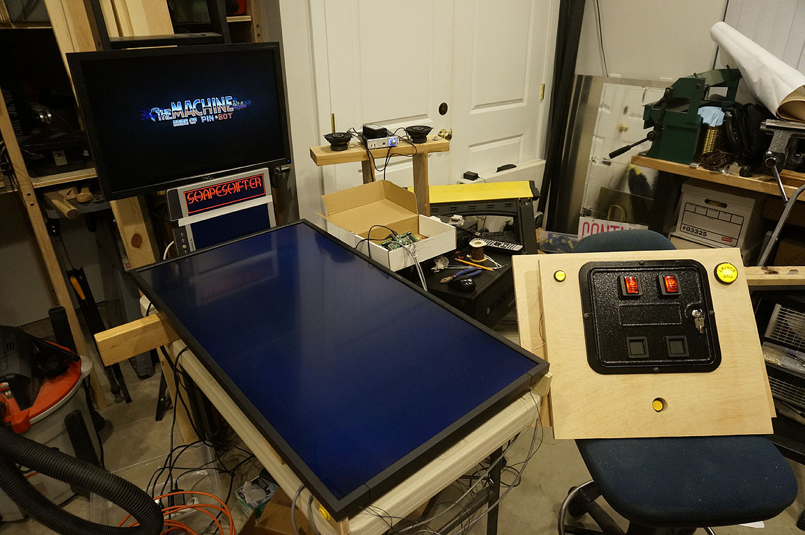 Anyway, once I had pinball service buttons, I had to play with them, so I lashed up another mock-up.  It was a chance to hack on the custom front-end software, too... and maybe a chance to sit down in a chair for a while, too.
