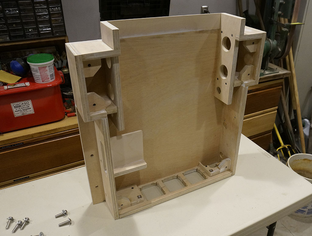 These test assemblies also serve as integration checks for me - this is the first time the whole backbox mounted to the back cabinet with the rear hatch installed, and that took quite a bit of sanding and adjusting to make work.  I also like keeping pictures like this around to look at while I've just got a bunch of subassemblies in front of me, to reassure myself this can yet become A Thing.