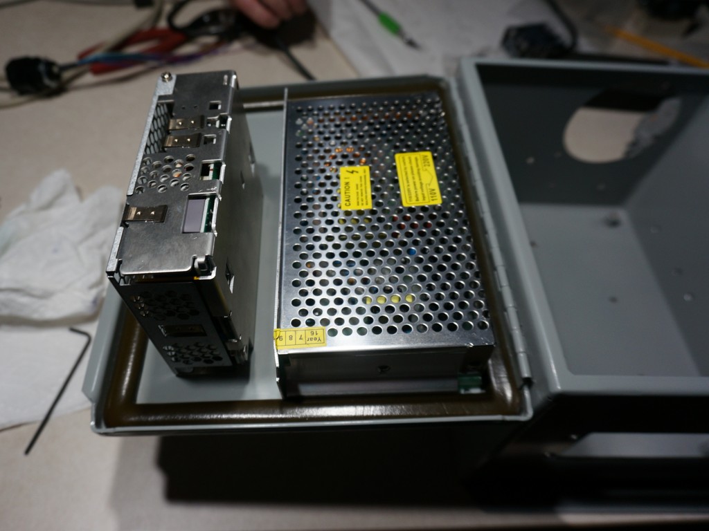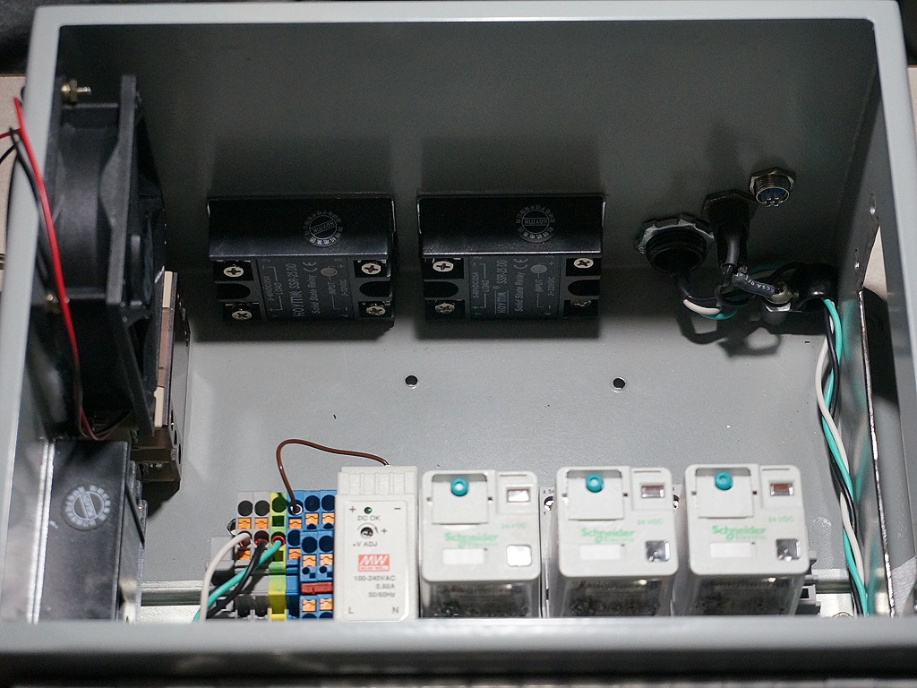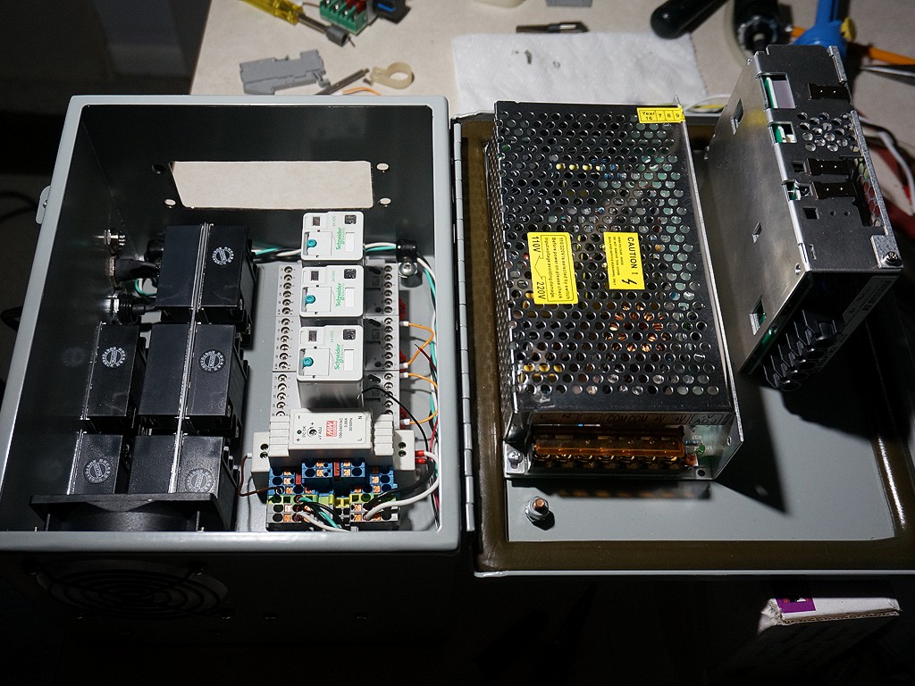 The tall 24v power supply swings in over the aluminum bracket full of six solid state relays, with about a half inch of clearance, which is half the wind tunnel going from the intake fan out the back of the box.  The flat 12v power supply swings in over the top of the DIN rail, with about 3/4ths of an inch of clearance, forming the other half of that air channel.