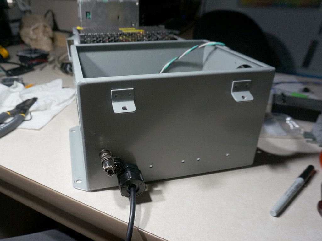 As oriented from the pinball player's perspective,  the front wall of the box has the 120v power, fuse, and a connector out to the playfield.  The back wall of the box has the DB25 signal cable to the backbox, and connectors for 1) the control panel stowing actuator, 2) the playfield rotation actuator, 3) the replay knocker, and 4) the various limit switches that will confirm to the PC whether the TV is horizontal or vertical, and whether the control panel is stowed or retracted.