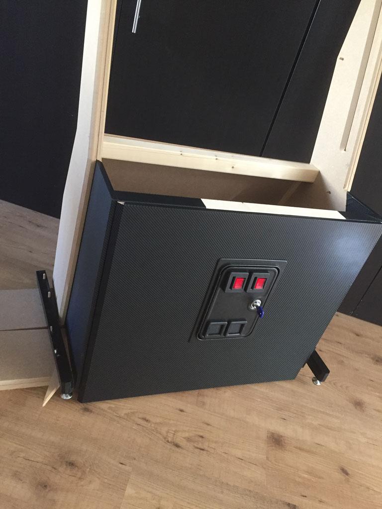 The front panel is fitted with ball catch fastener so the panel sits firm but can be easily removed. This way the cabinet can sit against a wall while I'm still able to access the PC inside the cabinet via the front.