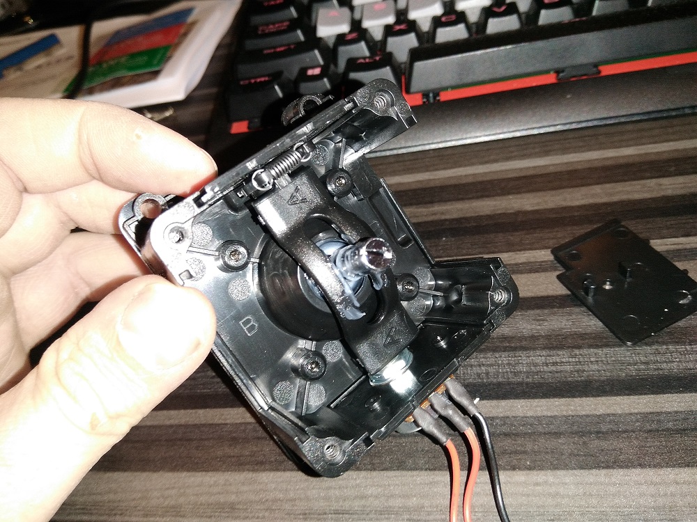It is captured between the joystick body and a top piece that's screwed down.  I thought it was interesting that there were washers in between, like maybe it was too tight of a fit and they had to add spacers.