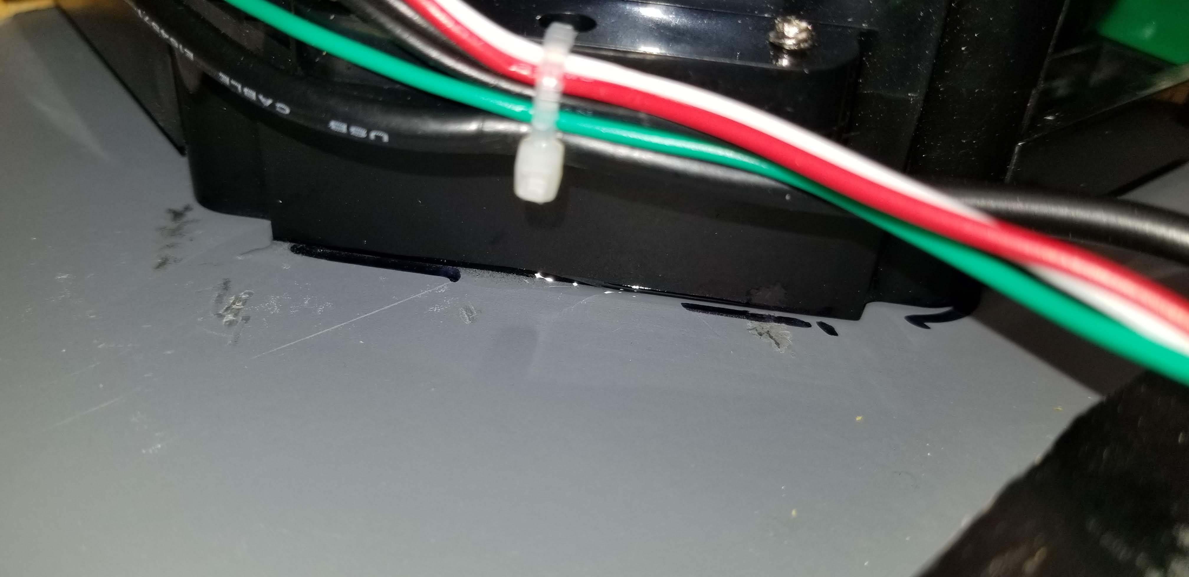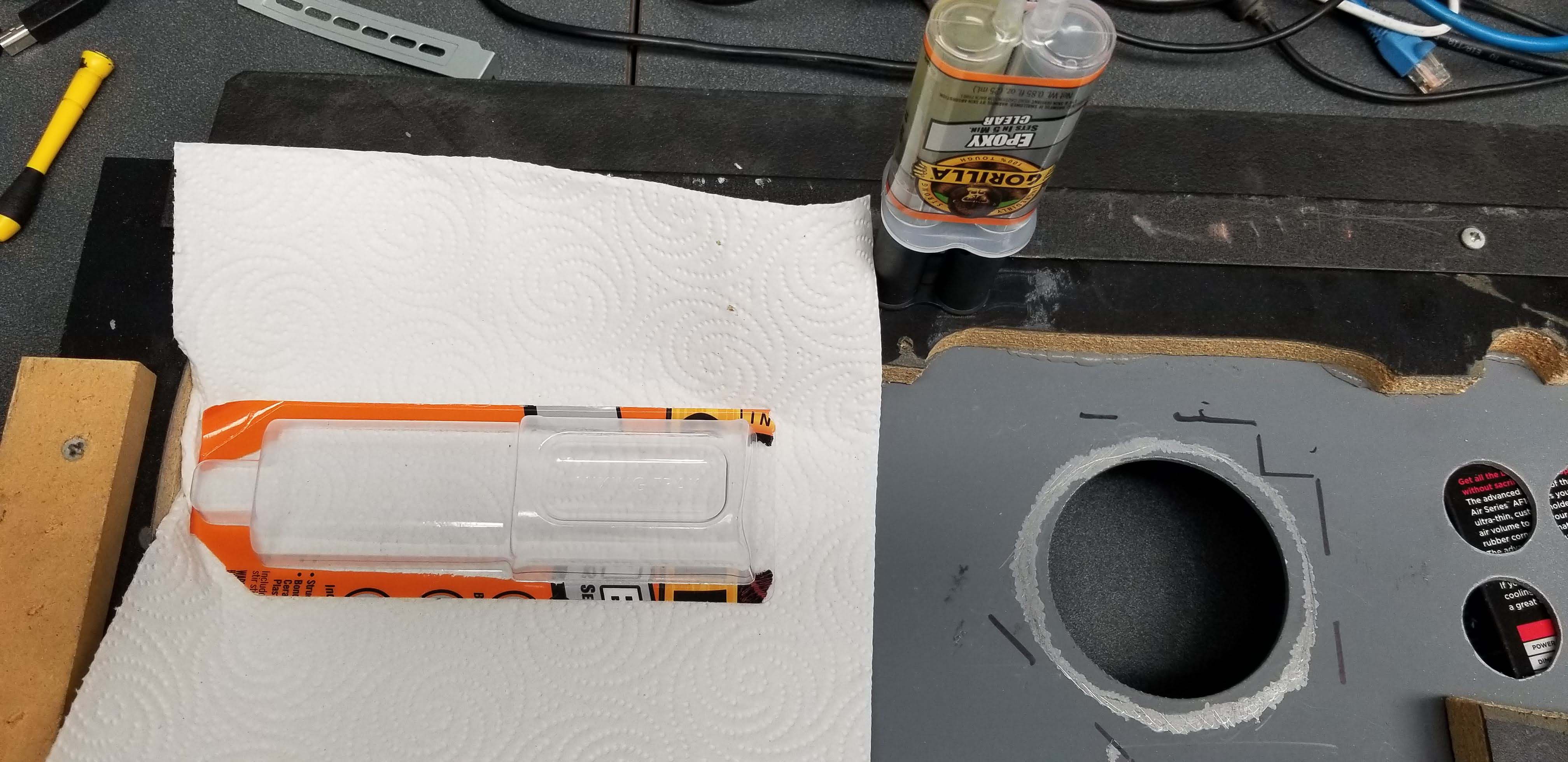 With the top panel looking so nice, I really didn't want bolt heads showing through. So I roughed up the area around the trackball, laid down some epoxy and hoped for the best!