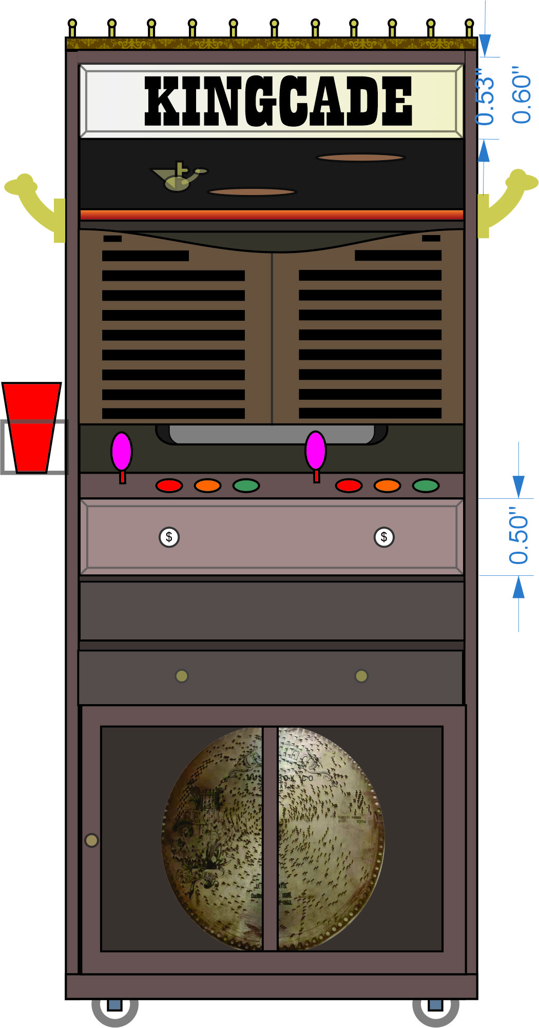 If I can make a suggestion, the 1c buttons look out of place. Maybe they whites are too bright? Maybe glue some wheat pennies to a distressed button, or maybe build a skeleton key that you turn to get credits?