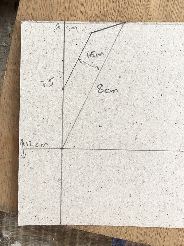 For the top piece, I just flipped the bottom and traced it out. This comes out a little large as the bezel support is a bit closer/tighter, "hypotenuse" only about 7.2cm. Not to worry, we'll trim that back soon