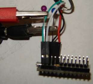- Connect one end of two alligator clip jumpers to the ground straight pin. (black or green wire)