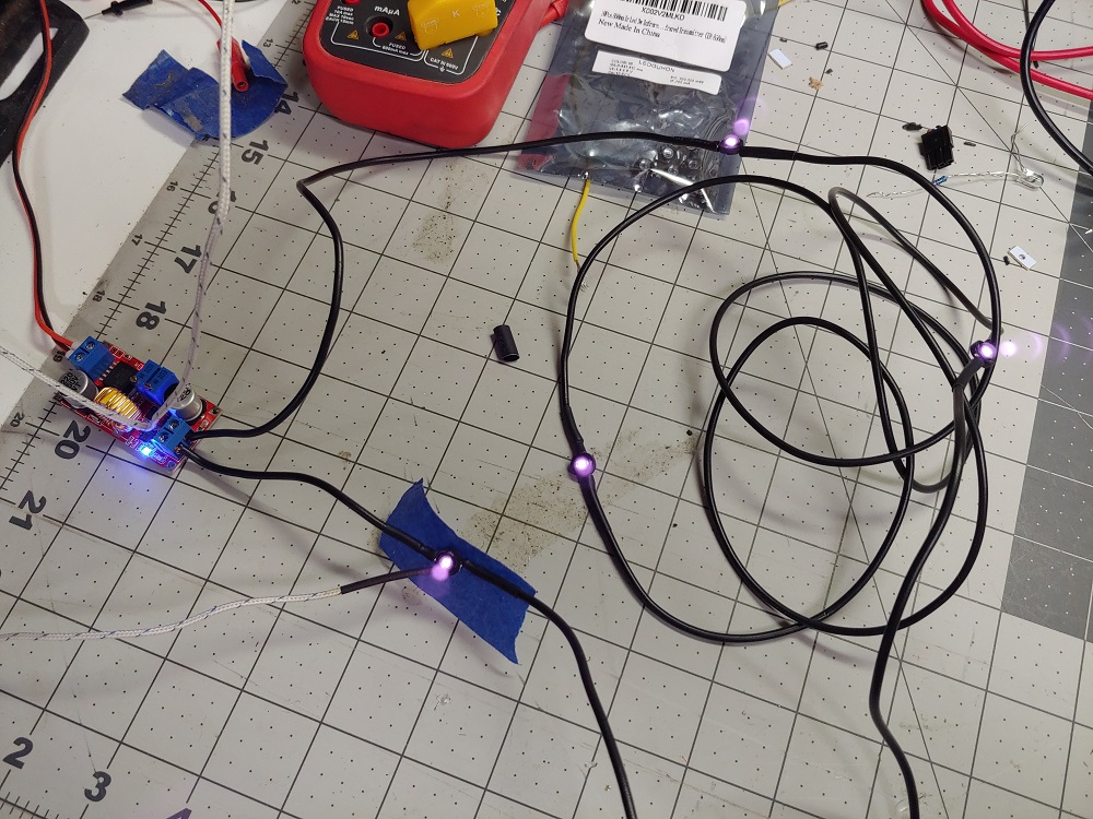 I made a wiring harness today for the LEDs and tested how warm they get.  They are 3 watt, but I think I can get away with no heatsink if I run them like 1 watt ones.  The $7 current limiter is definitely the way to go.  Adjustable and no messing with giant resistors getting hot.  I am running the LEDs in series at 6.5 volts and 300mA.  The package says they are rated for 700mA, but I am only giving them enough to get the job done.  Once they are in the cab behind smoked plexi, I may have to turn it up and add heatsinks.  I used fairly thick wire, so that is probably helping wick heat away.