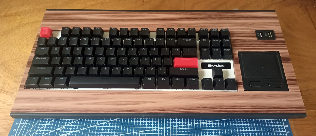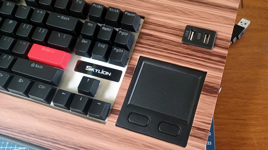 I ordered an inexpensive mechanical keyboard, a trackpad module with USB interface, and a small two port panel-mount USB breakout. The keyboard is a ten-keyless unit chosen for its compact dimensions, and the trackpad is a useful compromise between the need to have a pointer device for admin use and my desire not to have to rely upon an external mouse, as a mouse is a little out of keeping with the early computers that it's going to be emulating. The USB breakout is simply for conveniences sake, so that I don't have to reach around to the back of the machine to plug in USB thumbdrives and whatnot.