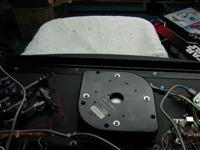 Just above the trackball you can see the piano hinge that was recycled from the original cab.