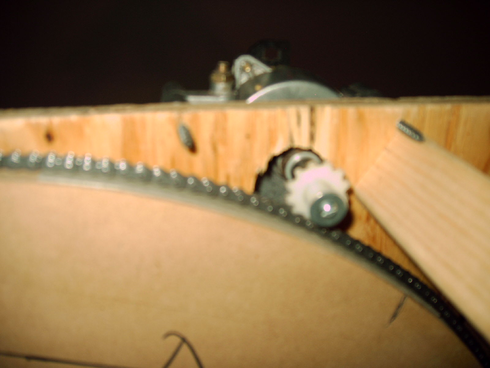 Here is the motor drive. The nylon sprocket rides in the chain, and pulls the MDF disk clockwise and counter clockwise.