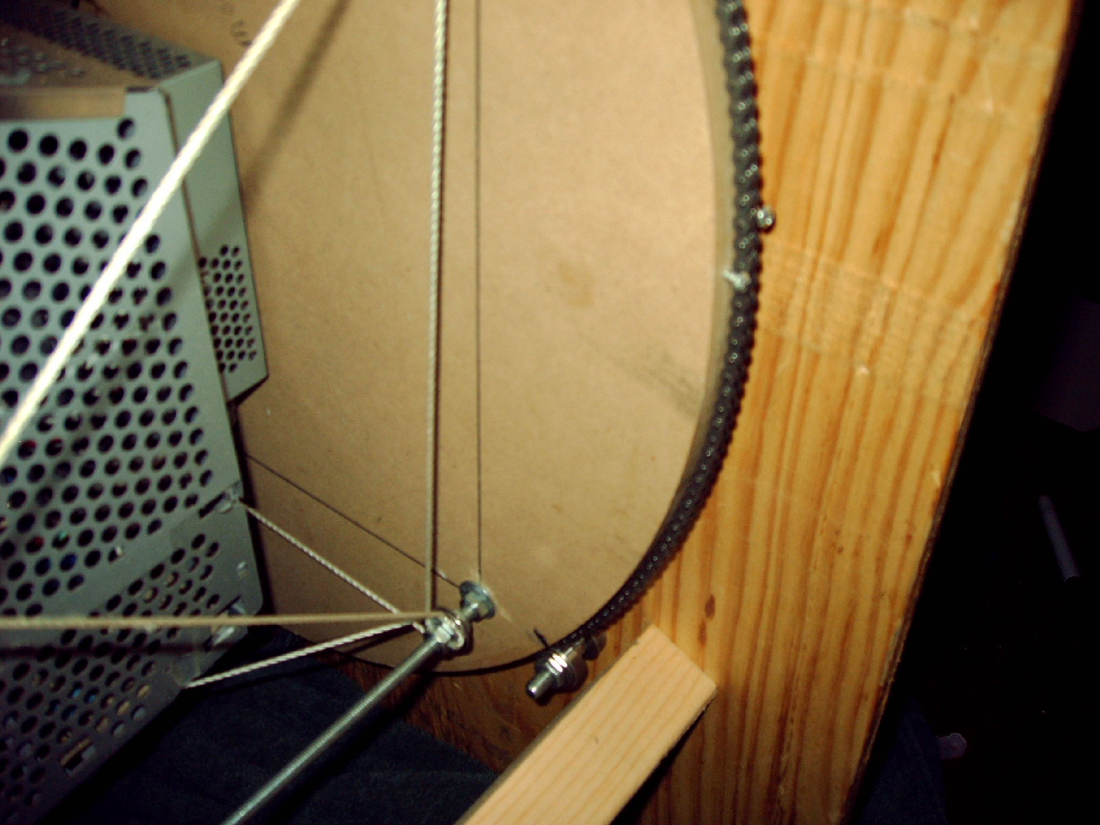 Here is the motor drive. The nylon sprocket rides in the chain, and pulls the MDF disk clockwise and counter clockwise.