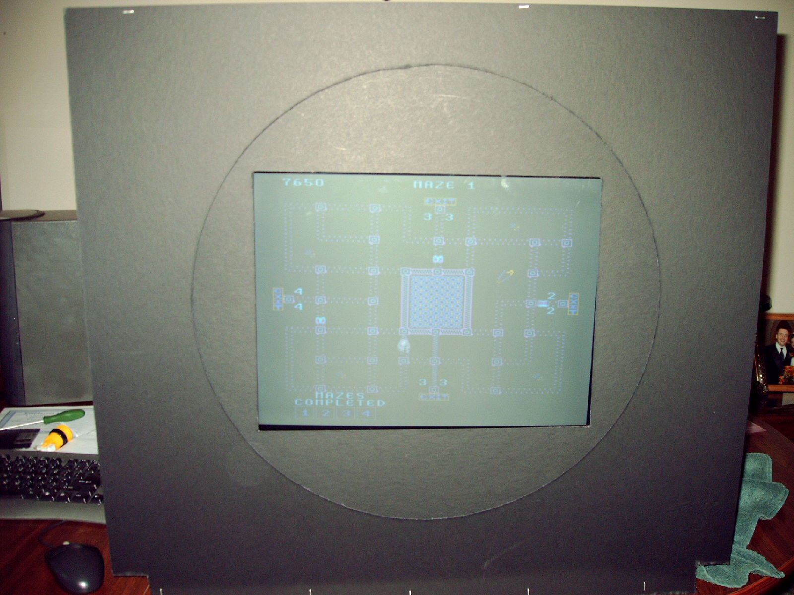 I cut out a circle of black poster board, then cut out the monitor screen in this disk.