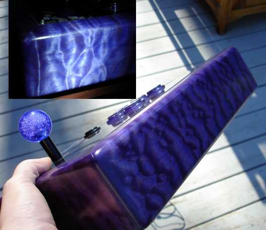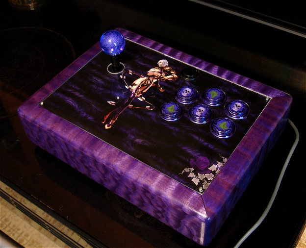 Then waited a day and then began clear coating with Minwax Polycrylic. I chose this because it is more of a true clear coat for going over colors and supposedly won't amber the color as much as polyurethane. The "lightning-like" quality of the quilted maple really started to show once the clear coat was on. Sanded up a few grits 400, 600, 800, 1200, 1500 and then used 3M rubbing compound and Mylan's wax for an almost-mirror finish. The cp is made from baltic birch and the Soul Caliber Ivy inspired artwork I had printed by MameMarquees. I originally planned to use clear Ultralux buttons so the button discs I made out of MameMarquees marquee material would light up, but when I saw that Seimitsu came out with the new screw style translucent buttons I opted for those in purple. The stick is about 2.75" tall because I originally planned on longer buttons. I actually like it tall like this, it sits well in your lap and it's quite heavy. The small pic within the larger pic shows some of the luster of the quilted maple but its brighter in person.