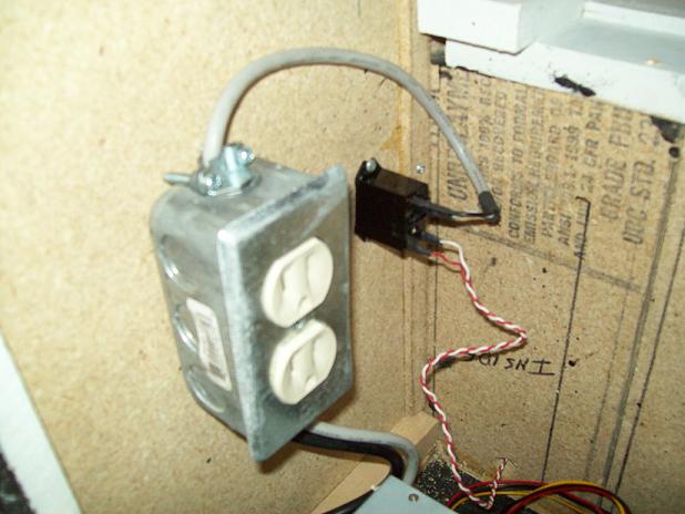 Here is the power switch setup. the relay turns on the duplex outlet. The monitor and speakers will plug into the outlet. The power supply cord is hardwired to the AC power cord inside the duplex "handy box".
