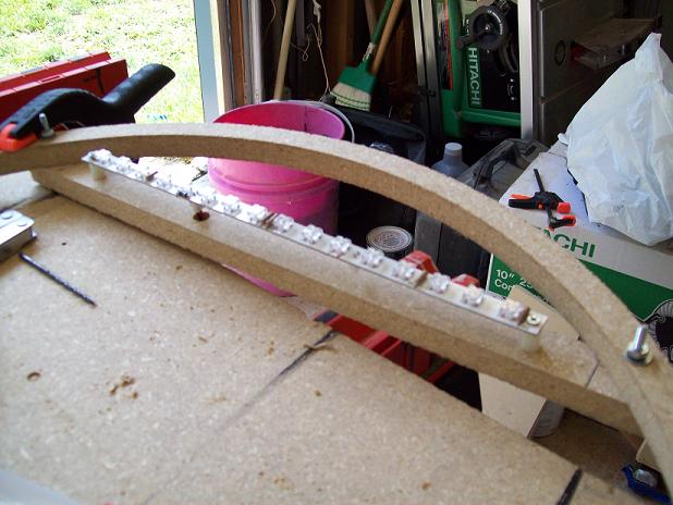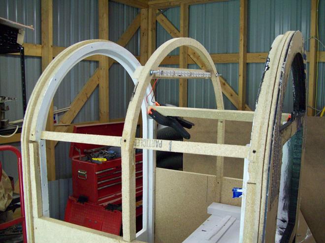 Ok, here is a picture of the ribs and two braces. The top center brace also served to mount the marquee light, which is a LED strip from Groovy Game Gear.