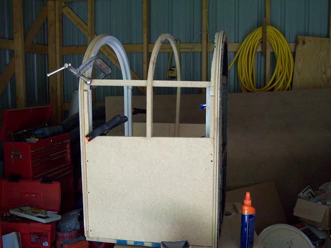 Here is the first layer of skin. I attached the skin to one side with screws along the bottom, I then smeared glue on the side panel and ribs, and wrapped the skin around. i used a lead weight (about 60 pounds I think), to hold teh skin until the glue dried. I then turned the cabinet over and continued around the other side. I put the weight on this side until the glue dried. I also put screws along the bottom of this side too.