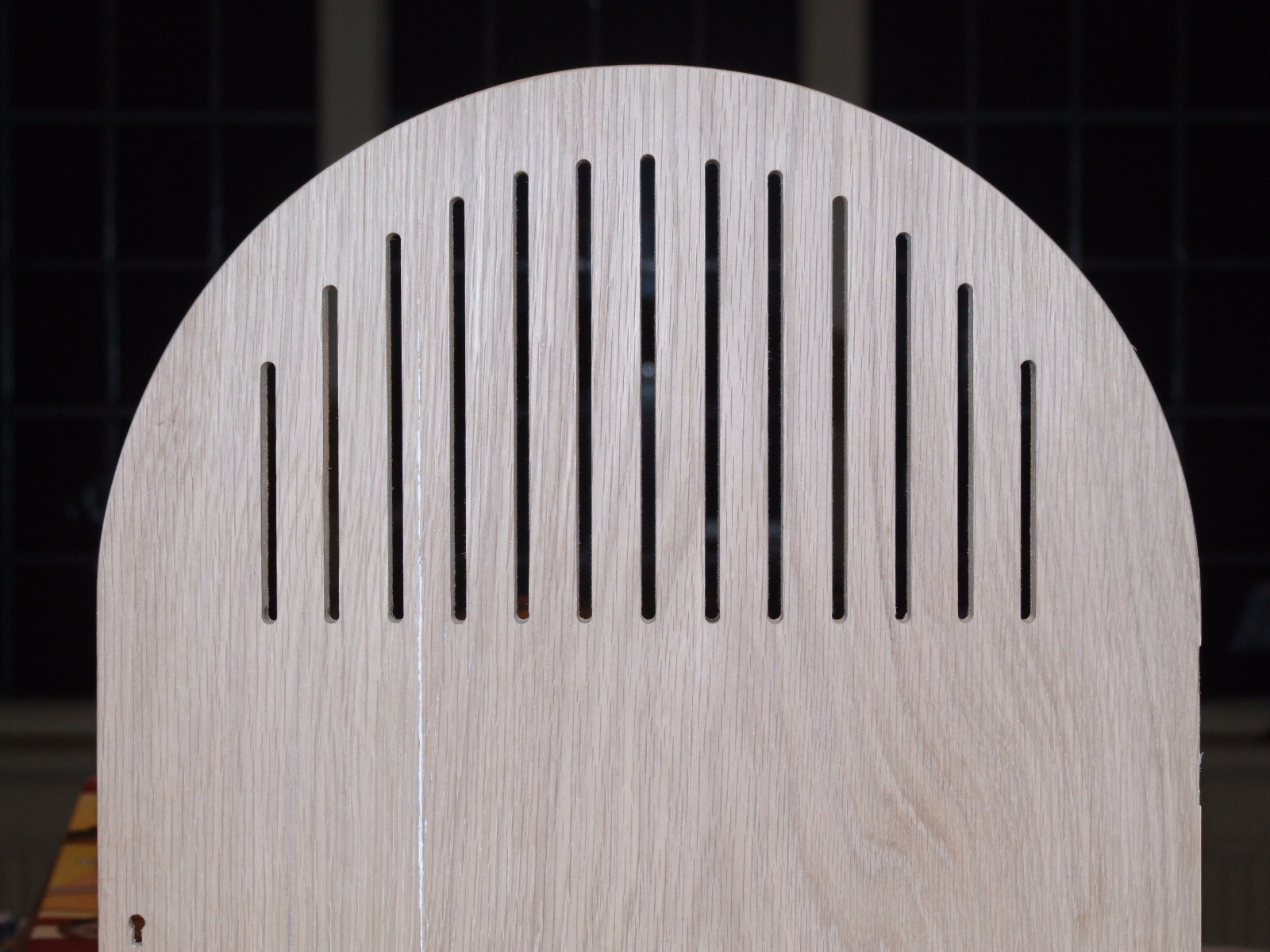 The top line of the routed slots follows a concentric circle on the same centre as the outer shape. Therefore if you measure from the top point of each slot to the tangent of the outer circle, the distance is the same for all slots  -even though it doesn't look like that in the pic!!