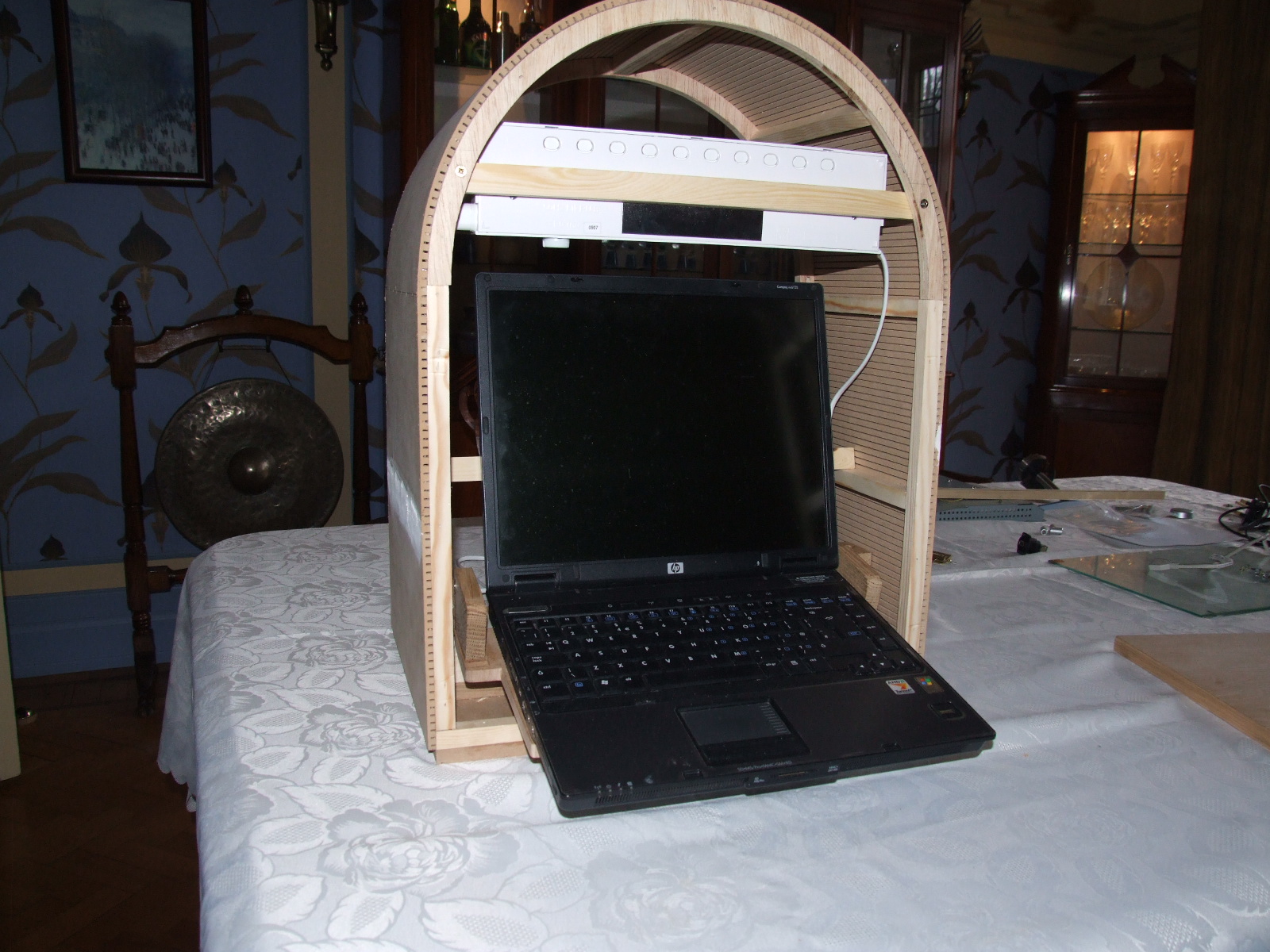 This is from the back with the laptop closed. Forgive the Heath-Robinson blocks getting everything to the correct height! If you notice where the laptop hinge is (toward the bottom) you'll see that there are two rounded pieces of MDF. This ensures that the laptop hinges down for acess along the axis of the laptop screen hinge.