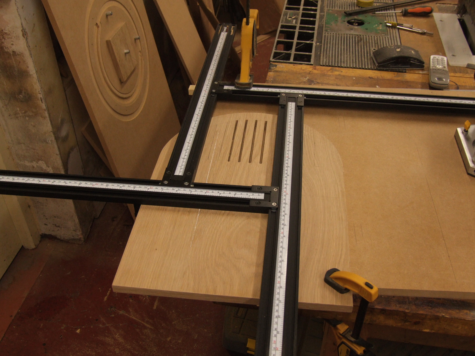 We decided to route some slots in the back door. I don't know the name for this tool, but basically once set the router fits within the internal space and its north/south travel is restricted to the correct amount by the horizontal rulers. This was after we'd done the first few slots - this took almost a full day as the spacing and length of each slot is absolutely critical to get the look we were after, and it was a one time only deal, obviously: