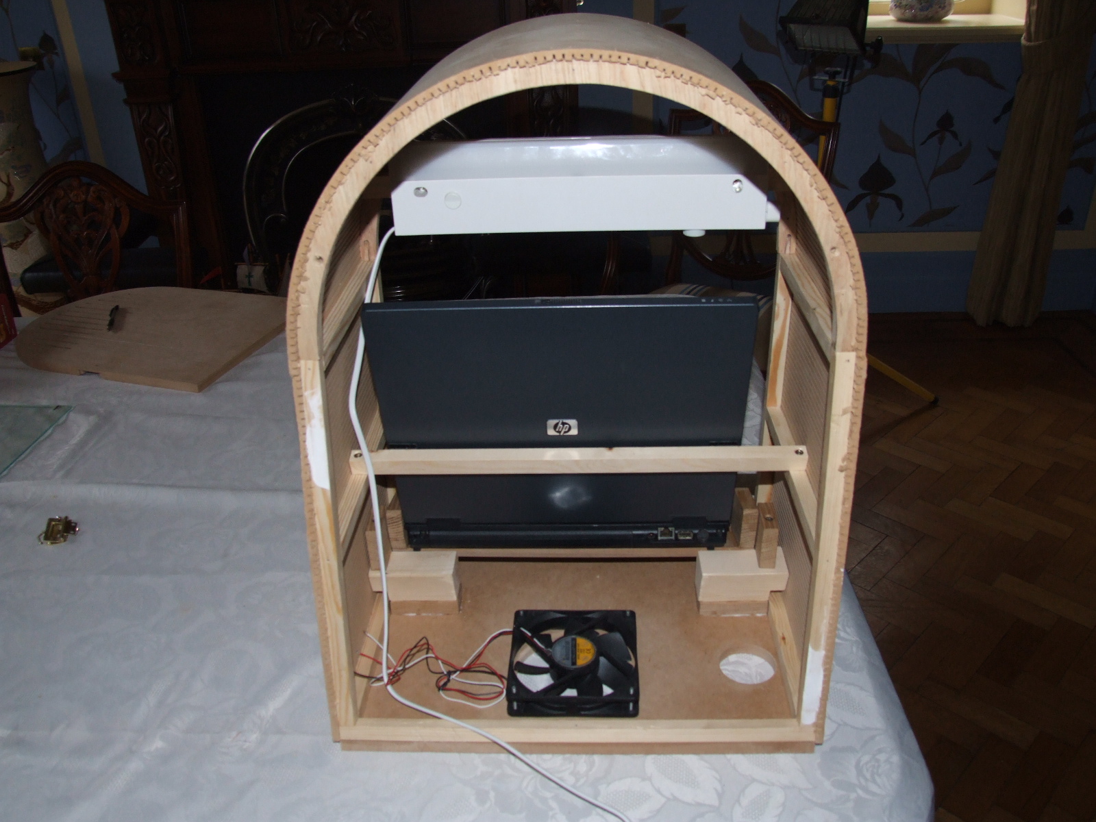 So, we made a little aluminium deflector which will fitover the fan, attached to the laptop support pillars. This will hopefully ensure that at least some airflow reaches the laptop but because it's 4" narrower than the width of the internal cab we still get airflow over the touchscreen. We hope. It's not up to Franco's metalworking but it suits the purpose :) I don't have an installed pic - everything is apart as we're staining - but hopefully my budget description and pics before will help...