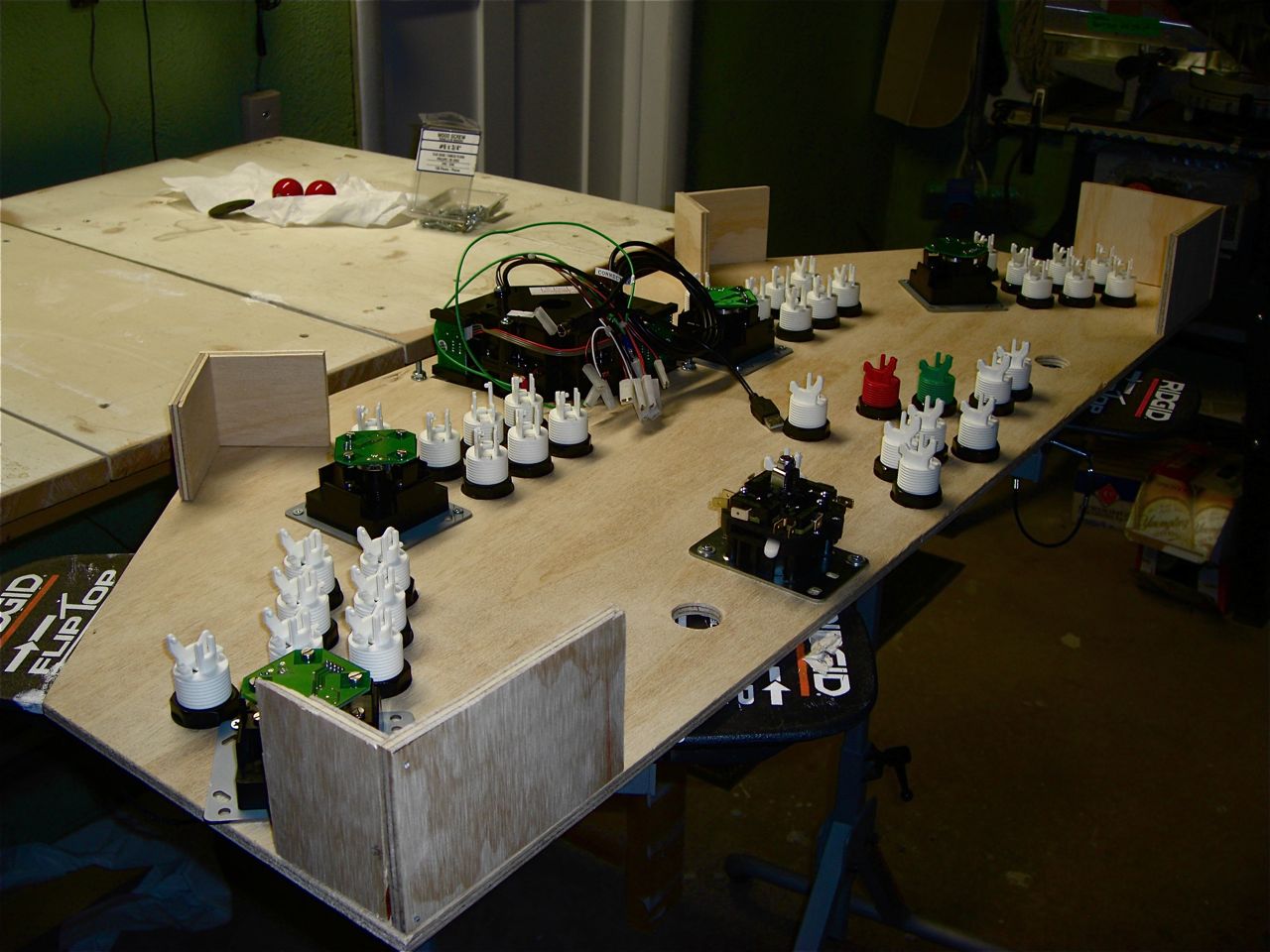 With the prototype panel wired and assembled, I’ve begun testing configuration and layout of the controls. This test run is performed on the iMac running “MAME Library” [url=http://www.randomsequence.com/software/mame-library/]http://www.randomsequence.com/software/mame-library/[/url] and “MAME OS X”  http://mameosx.sourceforge.net/ plugged in through the USB port. With all of the controls wired up, there are a total of 8 USB connectors coming of the top deck. Currently, I only have a 4-port USB dock, so a full test won’t be possible until I can pick up another 4-port at the local electronics store. This test run was performed using the main control deck, player two and three sticks and the trackball.