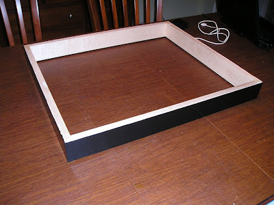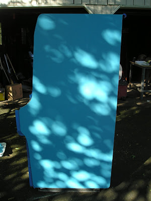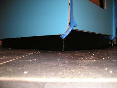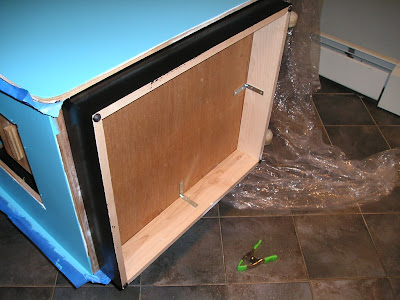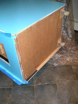 The last thing I did was take some powder blue paint and paint the exposed wood to match the cabinet exterior. Even though no one will ever see this I wanted to make it look somewhat neat even though it is kind of a mess. If I was building this from scratch I would have pre-drilled all of these holes prior to assembly and I would have rounded over the edges of the recessed holes. Oh well. It came out OK but most importantly it is going to work great.