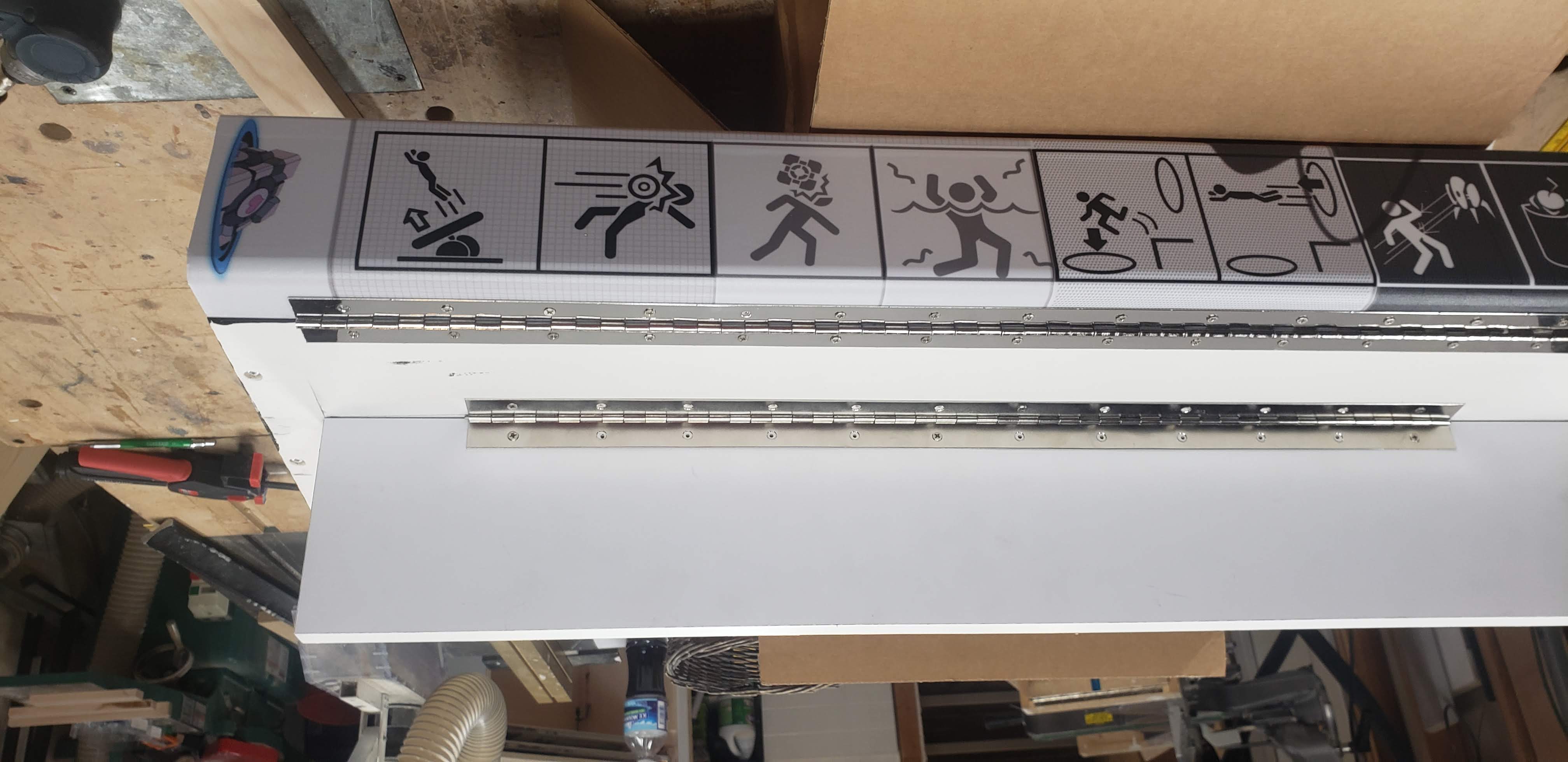 - used a 30" continuous hinge (piano-hinge) to connect the bottom of the support to the bottom of the control panel box, which is then secured to the cabinet with screws.