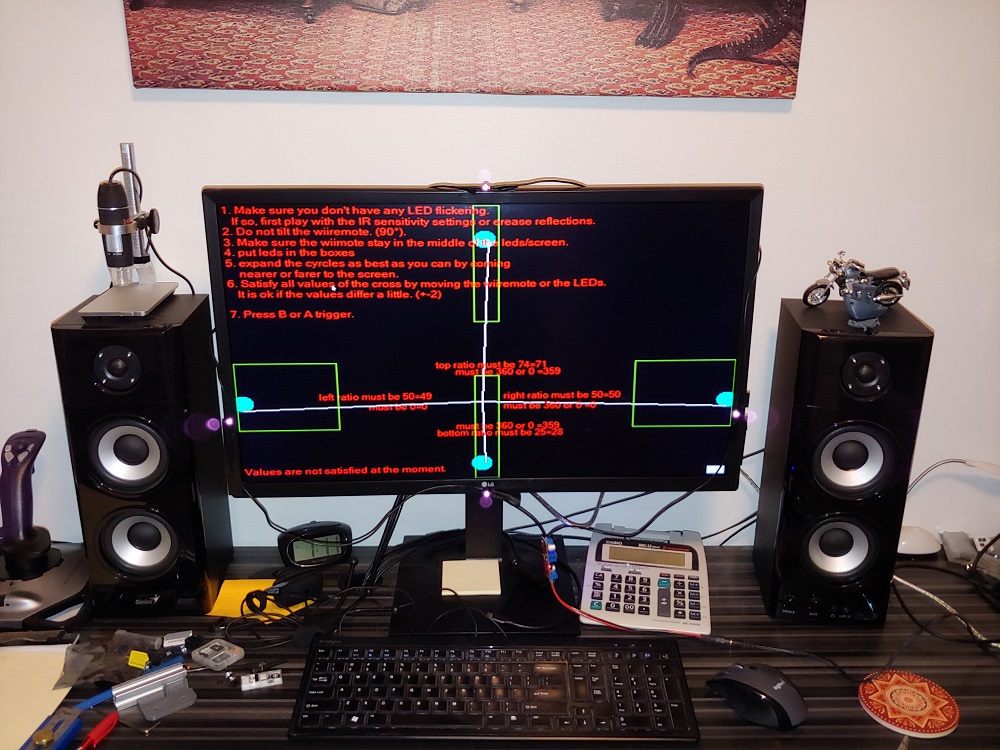 > Placed left and right LEDs on the ege of the screen based "3. default gun calibration" making sure that they were both the same distance from the bottom of the screen and the line between them was straight.  This resulted in them being a bit below the horizontal line in "2. default LED calibration".