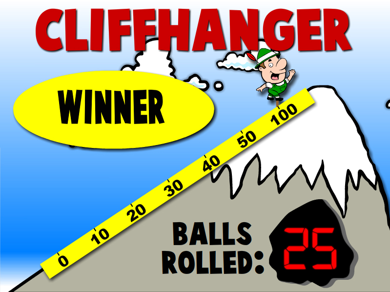 Cliffhanger: For those familiar with The Price is Right, you might recognize the visual similarities between this and the game from that show. When you hit the 10 ring he climbs to the 10 (and does a pretty sweet yodel), when you hit the 20 he climbs to the 20, and so on. The objective is to get to the top of the mountain (100) in the least number of rolls.