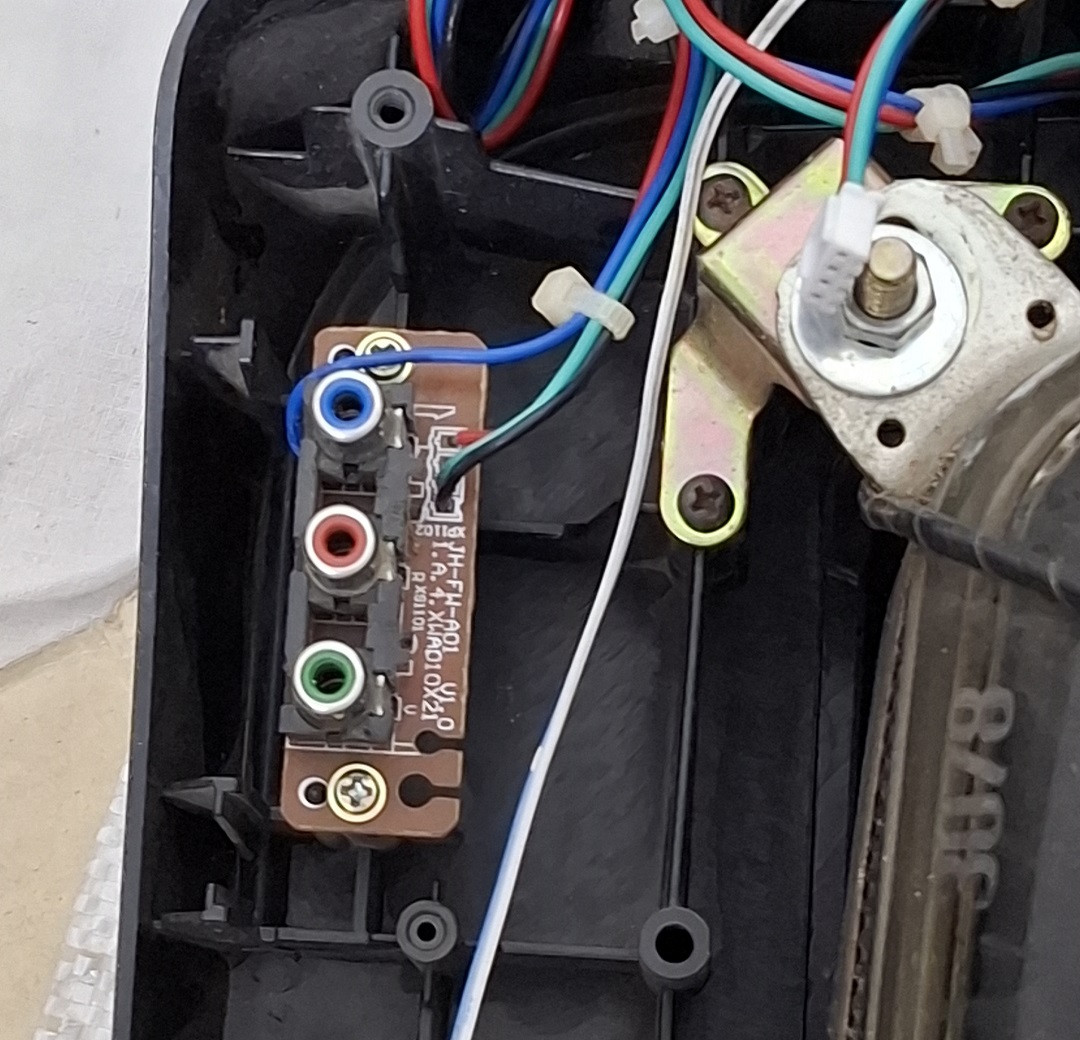 This is where those inputs will be connected to. I've modified the side AV input for component! Using a tiny screwdriver I carefully replaced the yellow/red/white facscia with green/blue/red. I also rearranged the connections a little on the back of the PCB (not pictured). Had to add a ground wire and rearrange the connector slightly after taking this photo.