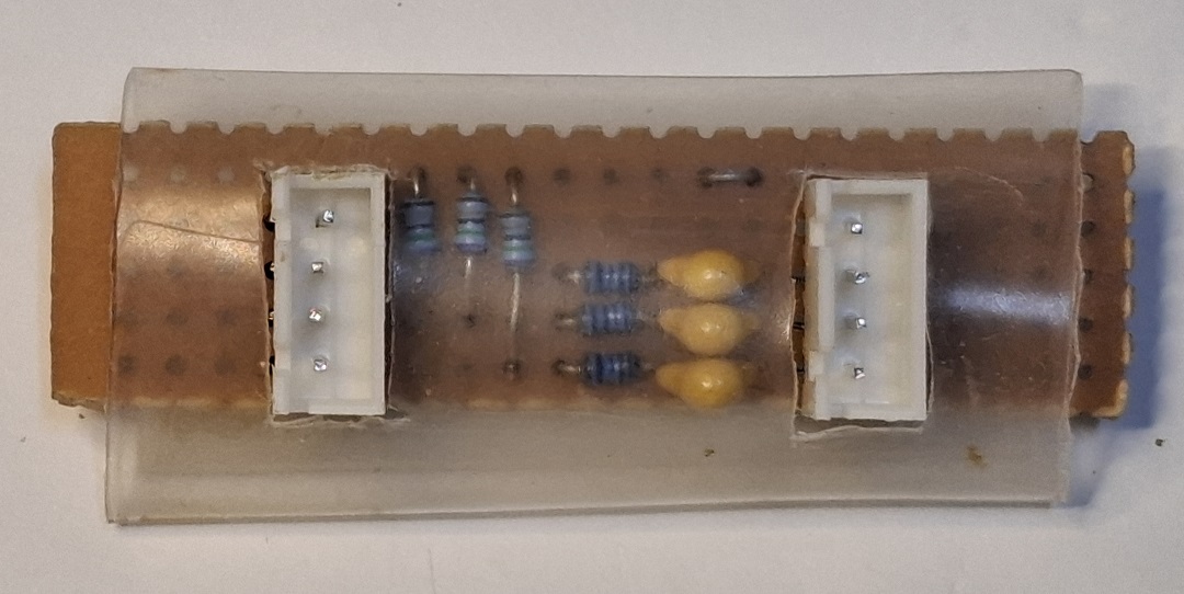 To make things more manageable, I created a mini input-PCBs for the input circuit. I used some offcut breadboard, 2 x 4-pin male connectors for IN/OUT, 3x100R resistors, 3x75R resistors, and 3x104 (100nF) ceramic capacitors. I've included a simple schematic. The last pic shows the input-PCB inside some heat shrink for electrical insulation. I cut some holes for the connectors. I didn't bother with heating the heat-shrink as it works perfectly the way it is, I can still remove it to get at the PCB inside, and those white connectors are a bit sensitive to heat.