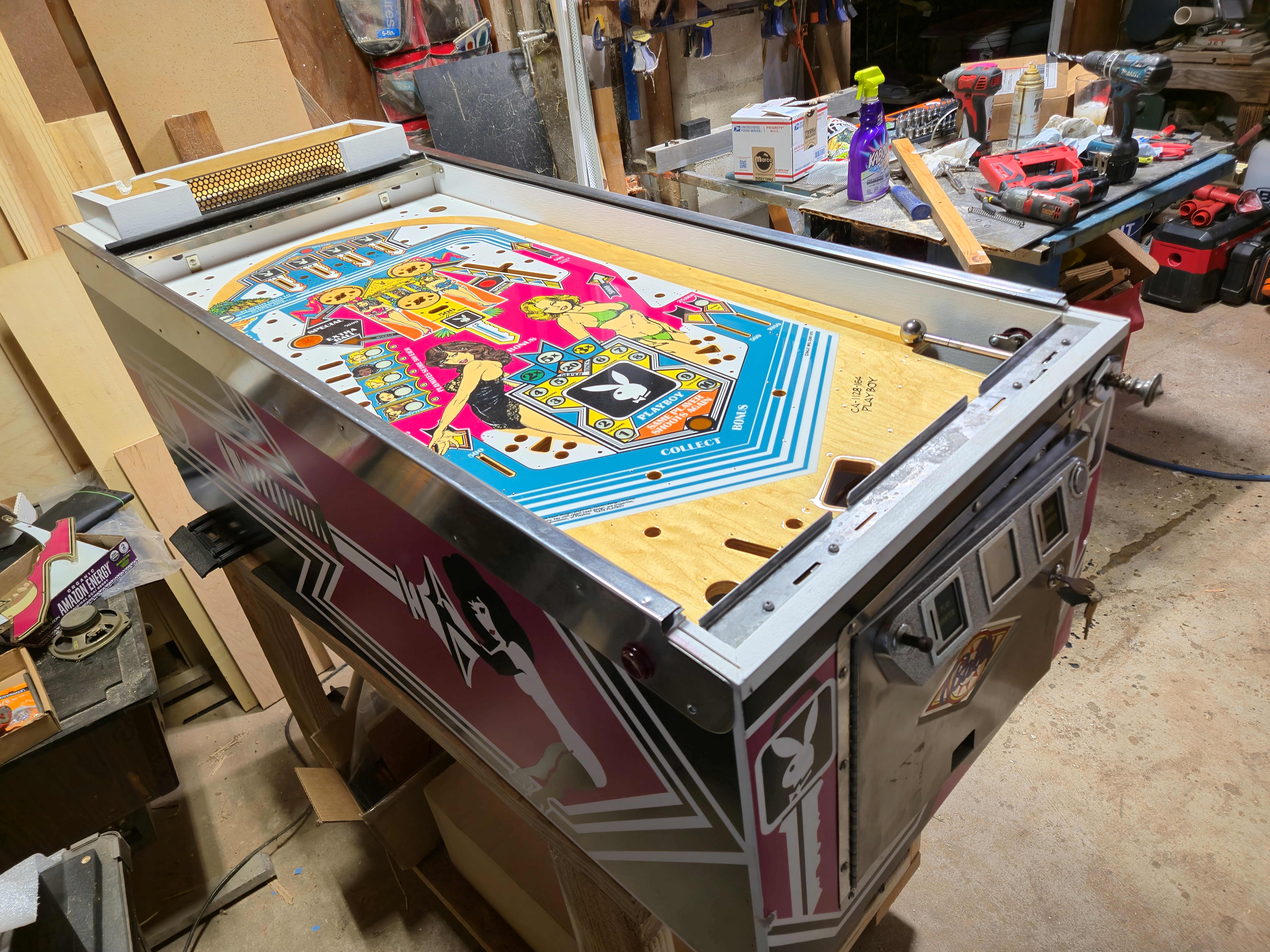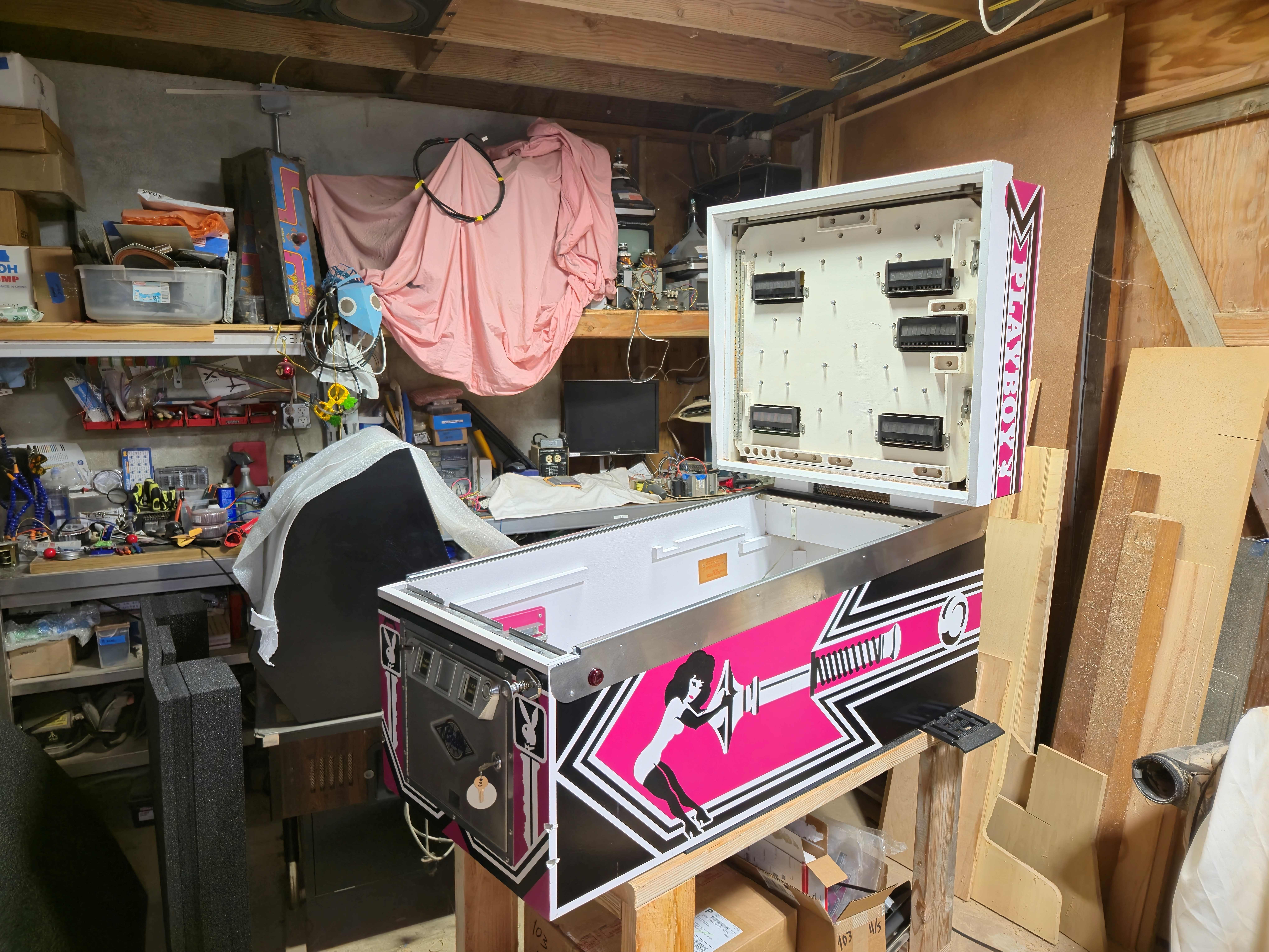 John and Chad helped me get the new coffin upstairs so it cleared the space needed down in the shop to get going on the playfield swap for real.