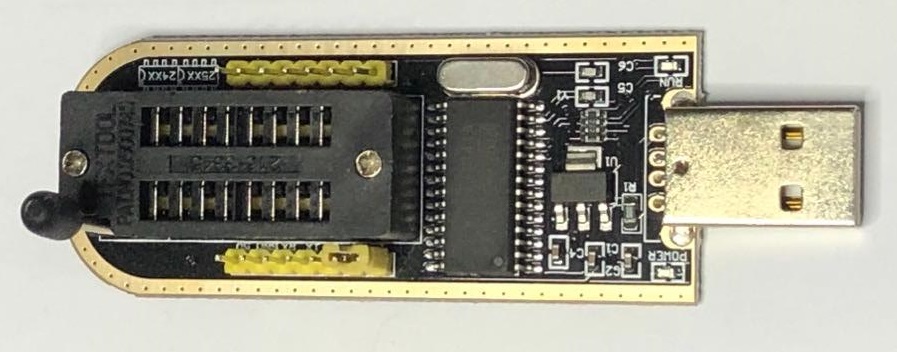 So I bought myself a cheap EEPROM programmer imaginatively called "CH341a", which works with the EEPROMs used in these China TVs (24C08). The unit comes as a kit with some useful accessories, including a clip that can piggyback onto the smaller surface mount SOP-8 ICs. Some pics below so you can see how it attaches.