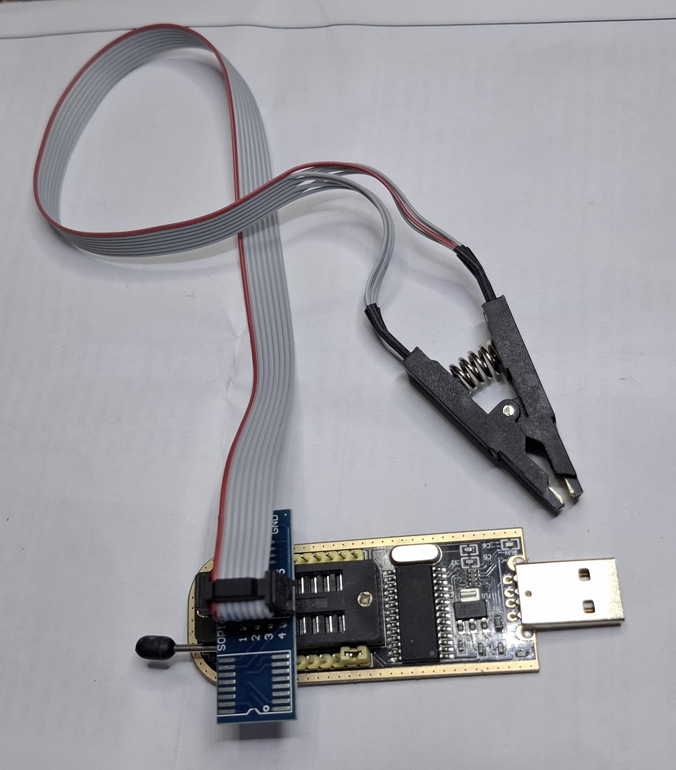So I bought myself a cheap EEPROM programmer imaginatively called "CH341a", which works with the EEPROMs used in these China TVs (24C08). The unit comes as a kit with some useful accessories, including a clip that can piggyback onto the smaller surface mount SOP-8 ICs. Some pics below so you can see how it attaches.