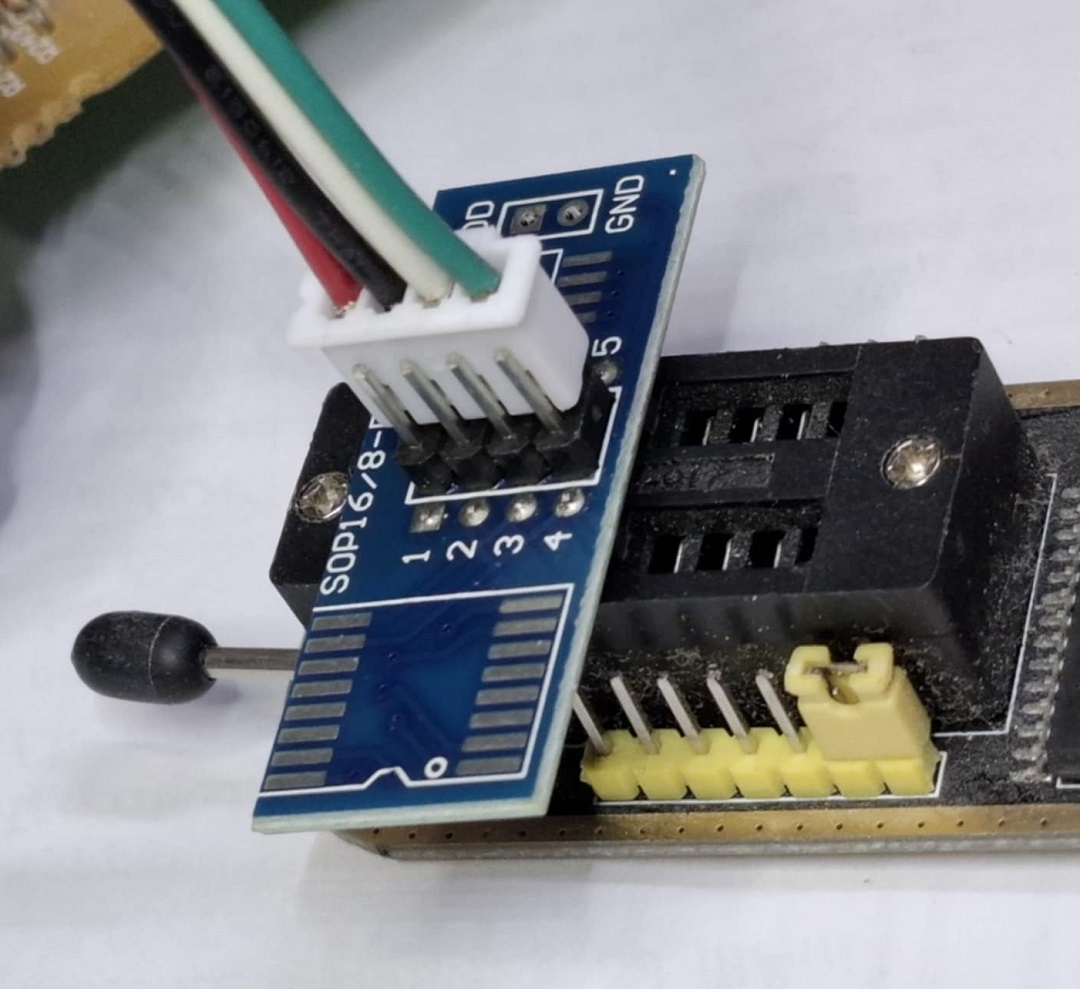 I already have the right connectors in that kit I mentioned earlier, So I added a male connector to that vacant spot on the older TV. I also made myself a short cable with two female ends, using red (5v) black (GND) and green/white for the data wires. Then, carefully considering the correct orientation for the pins and cable, I slotted the 4P connector onto the CH341.