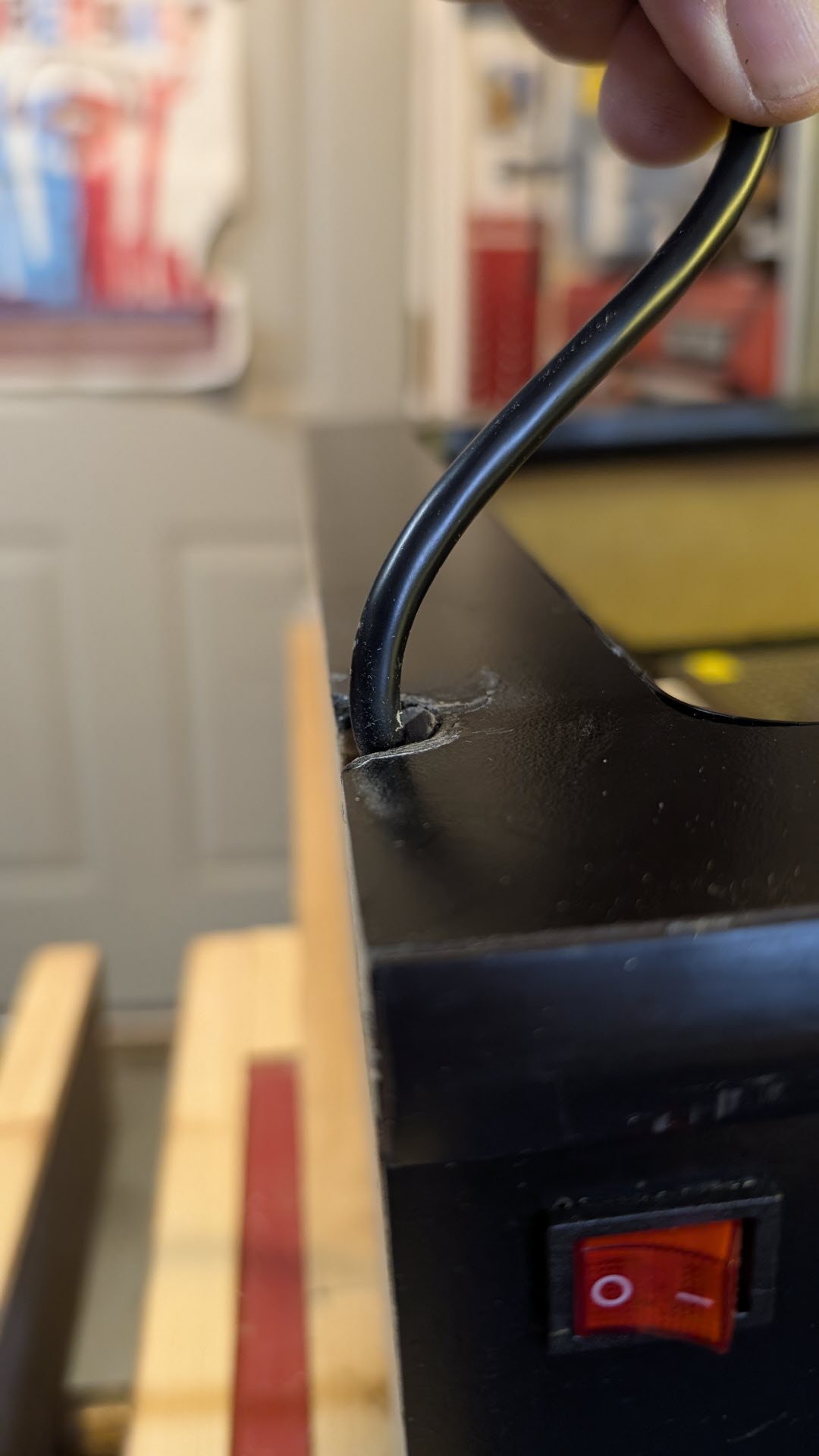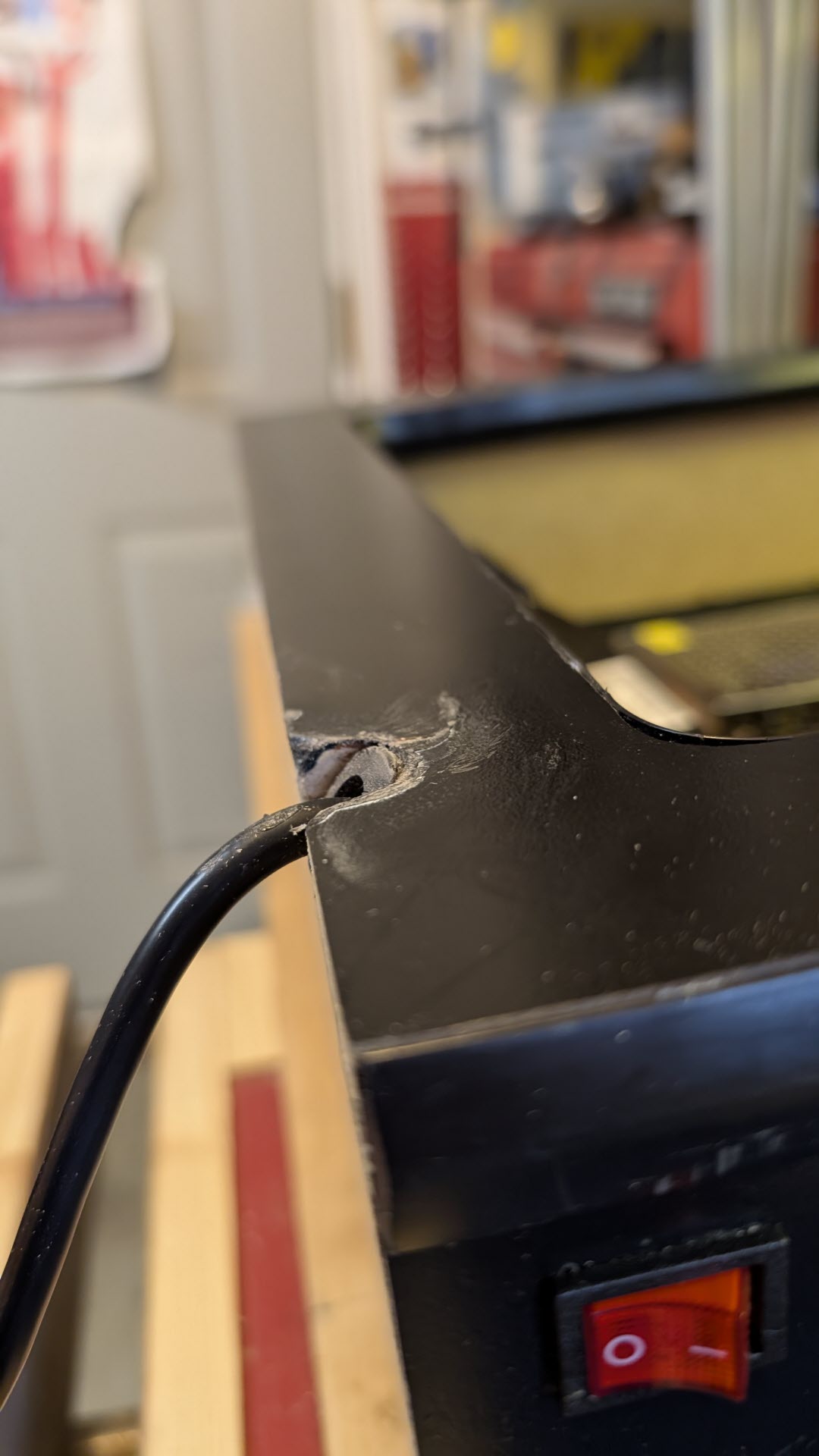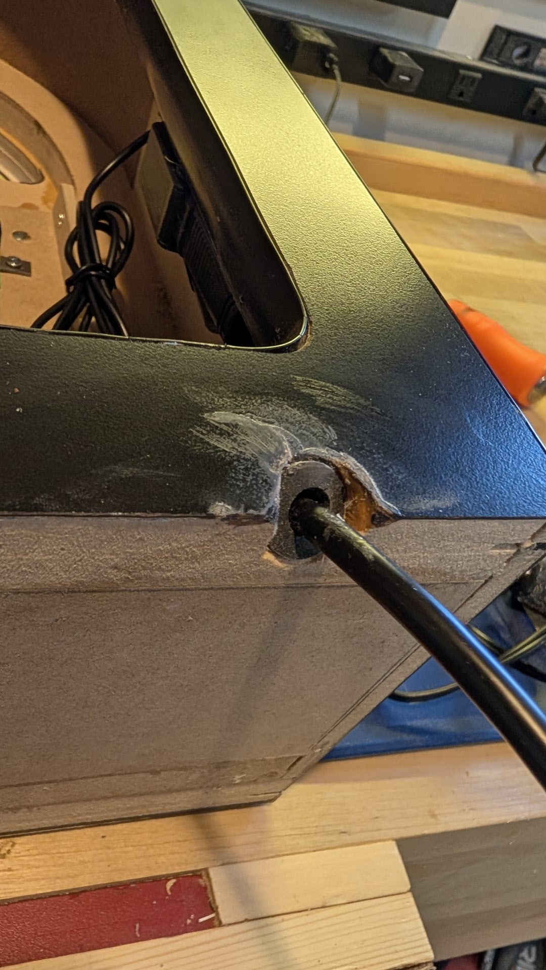 A couple oops I made - I drilled a hole in the back and I cracked the laminate there. Not super concerned because who is ever going to look at the back? Still irritating though. I drilled the hole for the power cord at an angle so it would be happy sitting on either a surface or mounted to the wall. I used some CA glue to "fix" the cracked laminate and to add reinforcement to the underlying MDF in that area.